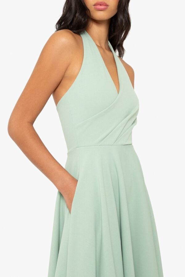 A timeless halter dress with a modern edge. Designed with a wrap V-neck bodice and delicate draping in a stretch knit crepe. it features a self-covered button closure at the back of the neck. The full circle skirt adds movement. while side seam pockets keep it effortlessly functional.