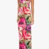 A striking strapless column gown featuring an abstract rose print that makes a bold statement. The structured bodice is designed with a cup detail and a draped overlay. creating a flattering silhouette.