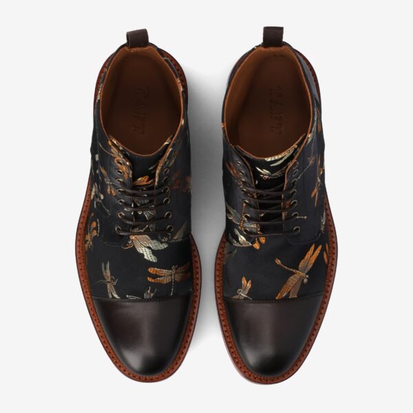 The Jack in Black Dragonfly is the ultimate boot for the bold. Feel fly with golden dragonflies against black Jacquard weave. These boots have had over 2.000 5-star reviews. and for a good reason too. Their lace-up feature makes them more reliable. comfortable. and built to last. The sole features leather with some rubber details that give it that perfect grip and durability. With how versatile they are. you can wear them to a formal event or with your casual clothing.